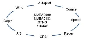 ボートの中には航海計器、AIS、レーダー、GPSプロッター、オートパイロットなど、様々な情報関係の機器が着けられています。しかし、これらはメーカーが違うとほとんど繋がれていないのが現状で、それぞれの情報が有効に使われていません。その原因は、それぞれの機器メーカーが、囲い込みを狙って、ネットワークの規格が決められているのに、独自のサービスを付け加えたり、ケーブルの規格を独自にしたりで、そのままでは繋がらないようにしていることにあります。
