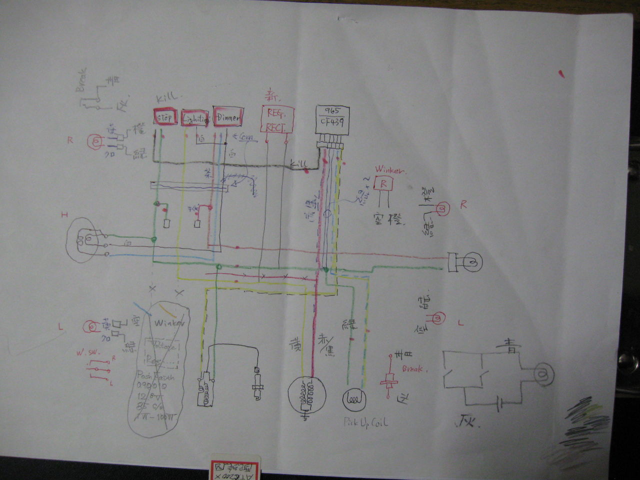 これがオリジナルの配線図で、わきに赤く書かれているのが追加の設備である。これらに電気を通すための配線を追加しなければならない。